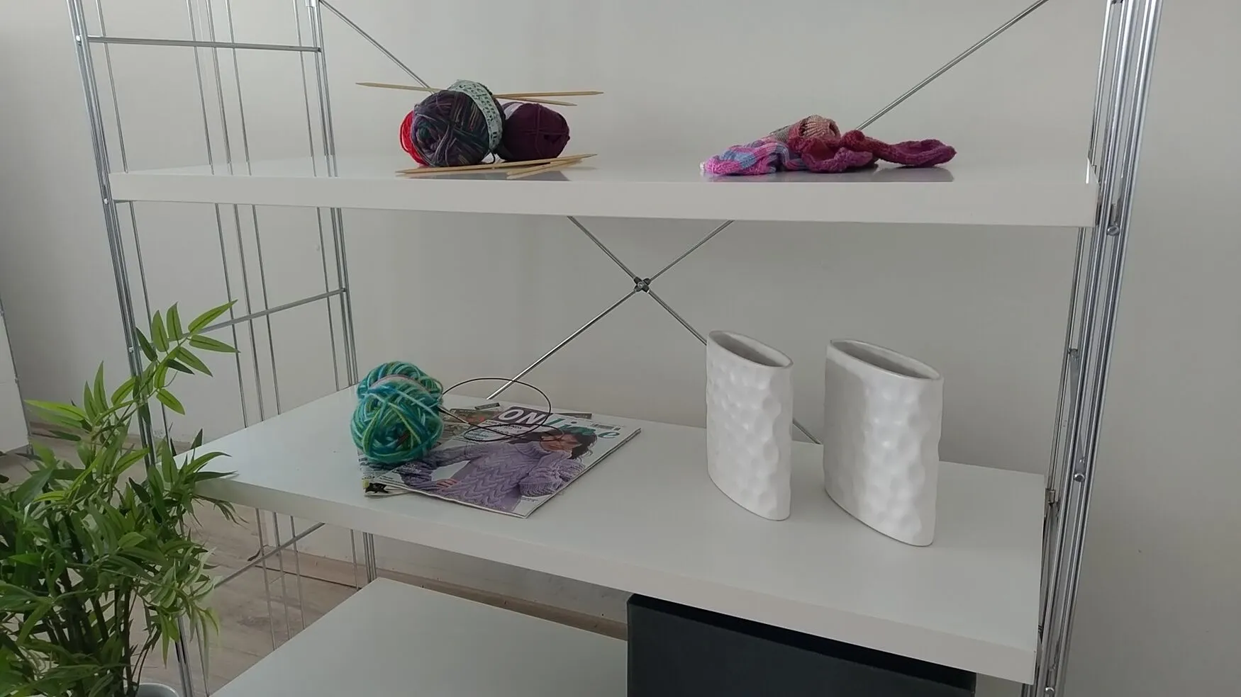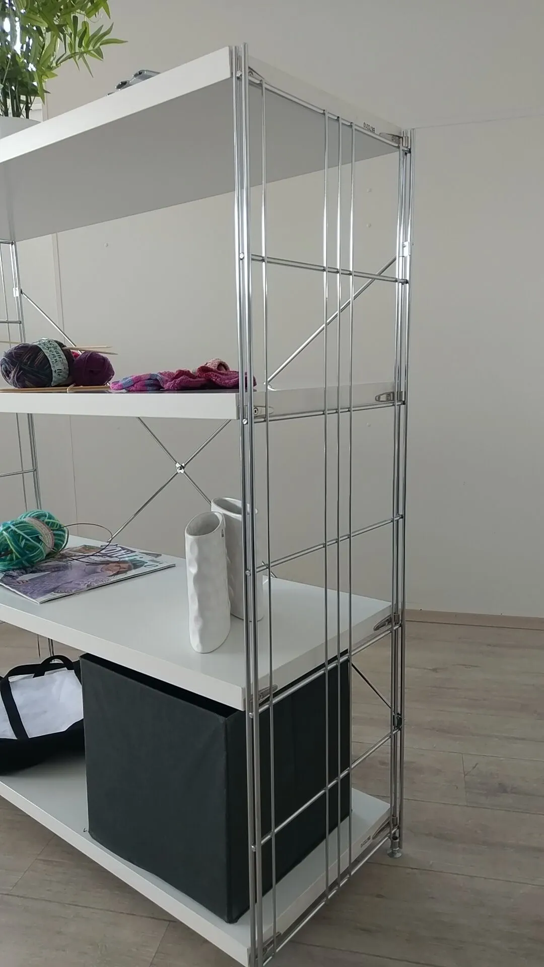 Hippes Metallregel mit weißen Regalböden. Das dekorative Regal bietet viel Stauraum.  Die Holzböden sind 3,2 cm dick und werden mit Halterungen geliefert. Die Montage erfolgt durch Einhängen in die jeweiligen Regalfelder. Die Abstände zwischen den Rastern betragen 18,3 cm. Die Holzböden können individuell angeordnet werden.