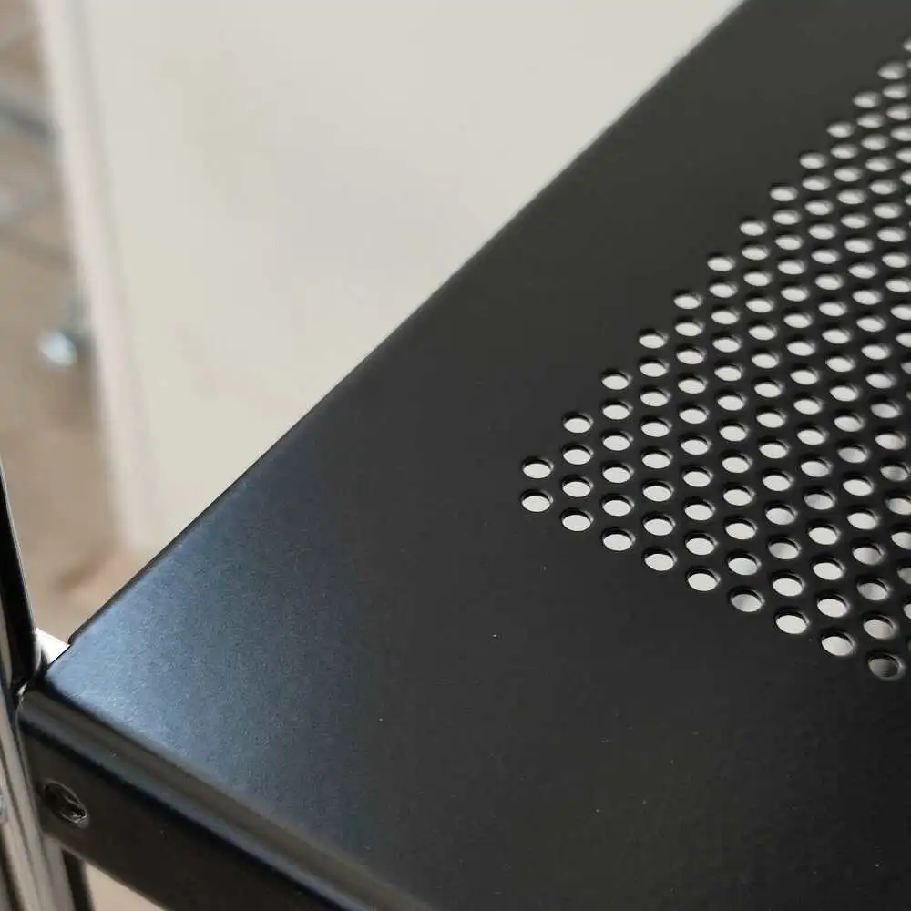 1x Lochblechboden in der gewählten Breite (matt schwarz beschichtet), mit 4 Beschlägen zum Befestigen des Boden