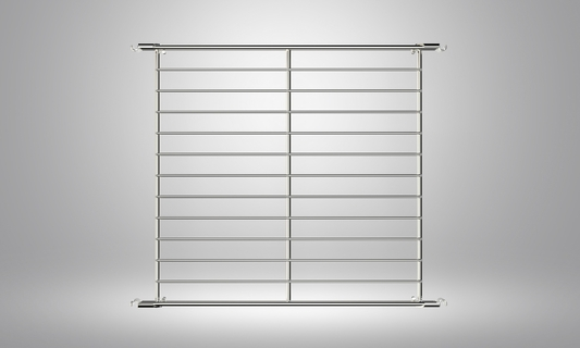 Hochwertig verarbeiteter Gitterboden aus verchromtem Stahl mit 4 Beschlägen zum Befestigen des Regalleiter Diese liegen dem Boden bei. Die Innenmaße des Gitterbodens ohne Beschläge beträgt 395x370 mm.