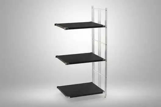 Die Regalböden lassen sich beliebig in den Querverstrebungen anordnen.  Das Regal lässt sich durch Holzböden, Gitterböden und Elemente aus der BIII 380 Serie individuell erweitern.